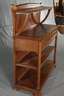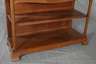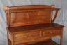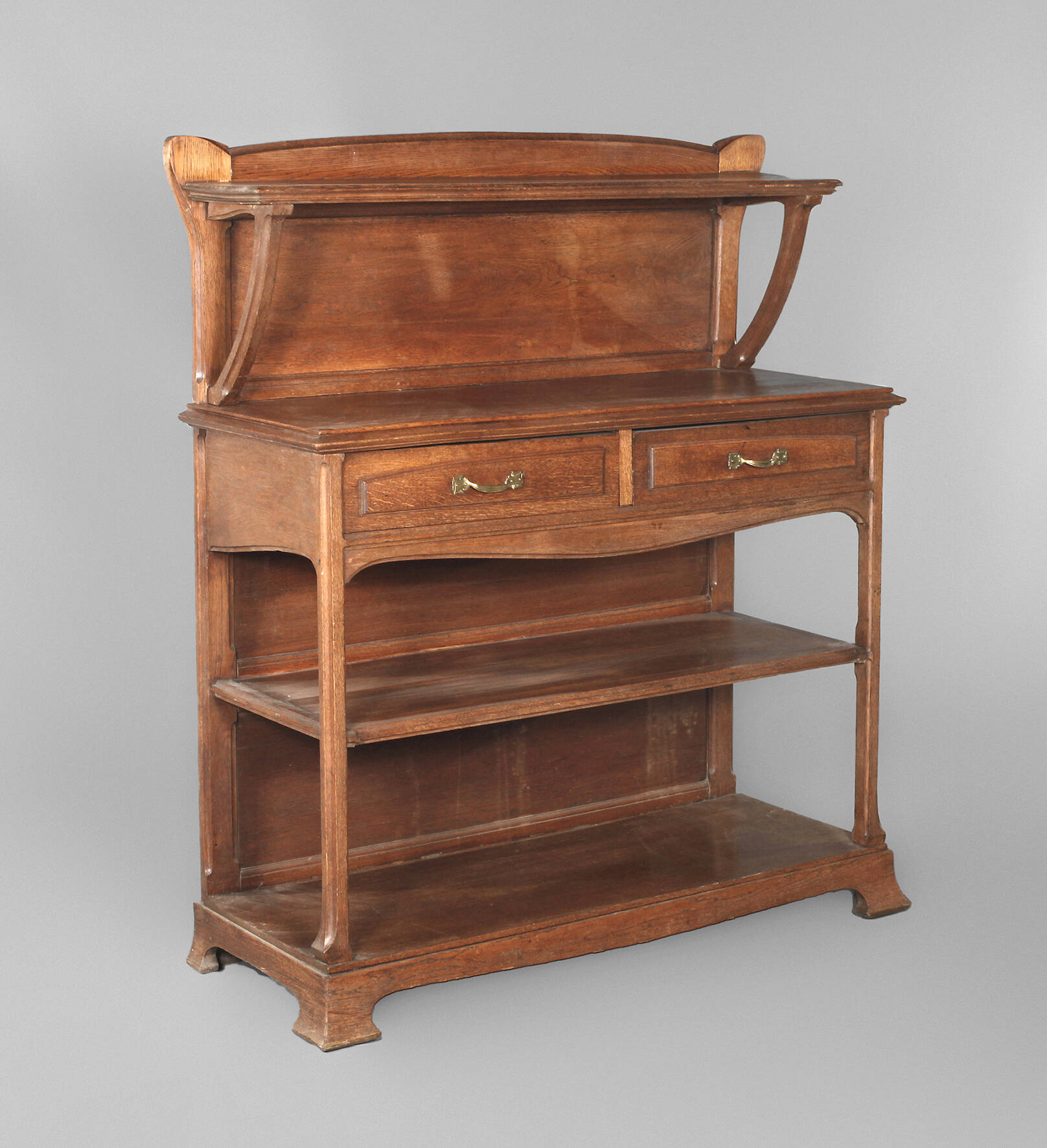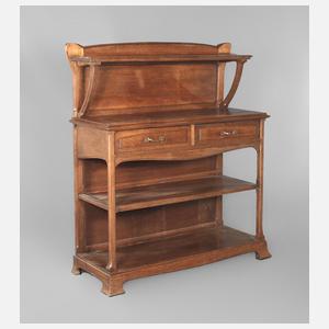Frankreich oder Belgien, um 1900, Eiche massiv, mittelbraun gebeizt, offene Regalanrichte, zweiteilig zerlegbar, mit zwei Schubkästen, originale Messingbeschläge, Platte mit alt restauriertem Trocknungsriss, sonst normale Altersspuren, Maße 145 x 124 x 46 cm.