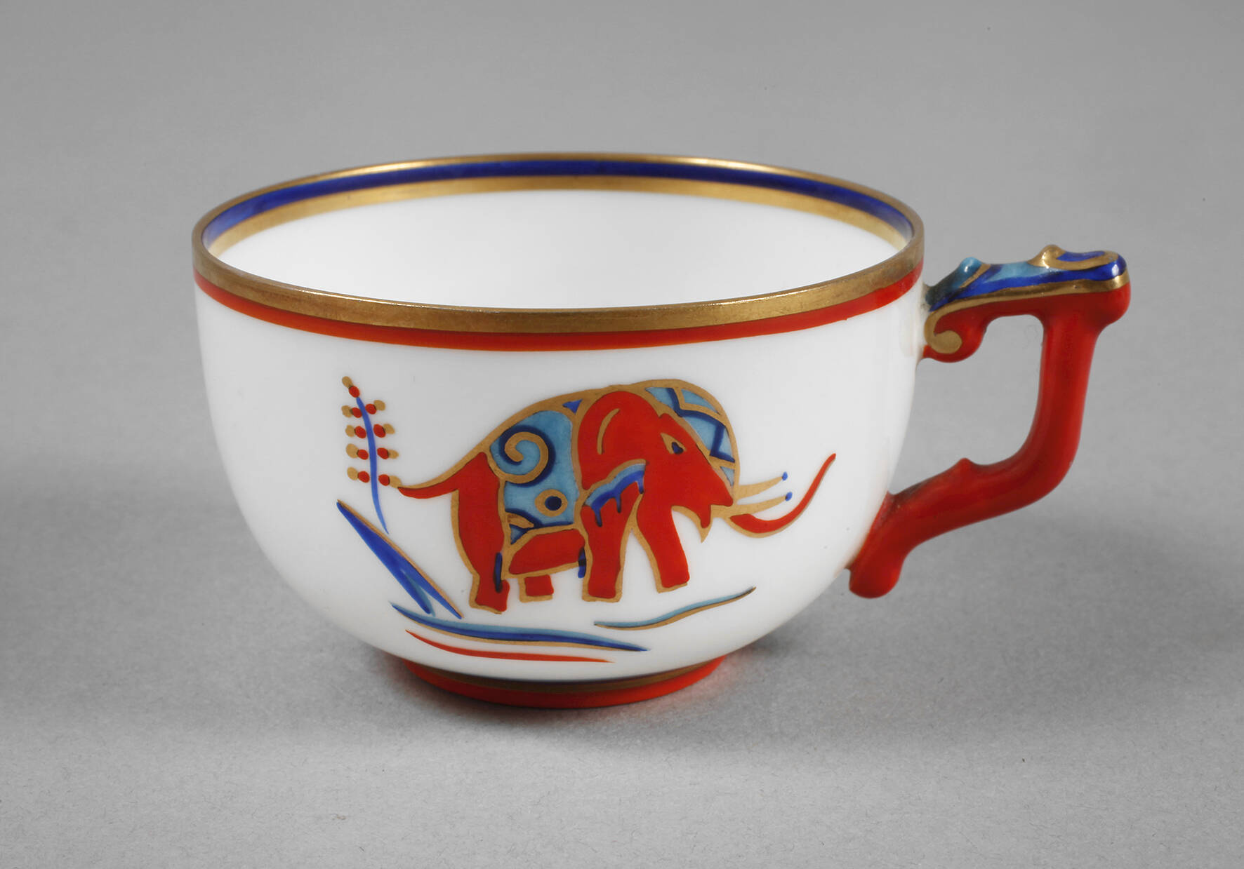 Dekorentwurf Kurt Wendler 1921, undeutliche grüne Stempelmarke mit Zusatz Selb-Bavaria vor 1927, Form „Rosalinde“, schauseitig stilisierter Elefant und Randlinien in farbenfroher Aufglasurbemalung mit Goldstaffage, Farbfassung am Henkel mit kleiner Fehlstelle, H 4 cm.
