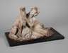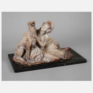 1920er Jahre, unleserlich signiert, Modellnr. 288, Rokokodame mit Barsoi, auf einem geädertem Marmorsockel montiert, guter altersgemäßer Zustand, L 50 cm.