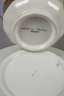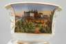 unterglasurblaue Strichmarken 1826–1951, einmal mit gepinselter Bezeichnung bzw. Präge- und Pinselnummer, Tasse in breiter zwölfkantiger Glockenform mit Standring, Spitzhenkel, schauseitiger Rechteckkartusche mit Schlossbergansicht in feiner polychromer Aufglasurbemalung, umlaufender floraler Goldmalerei und Goldrand sowie breitem Goldband innen, dazugehörige Untertasse mit gleichem Golddekor, Vergoldung minimal berieben, H gesamt 7 cm.