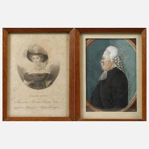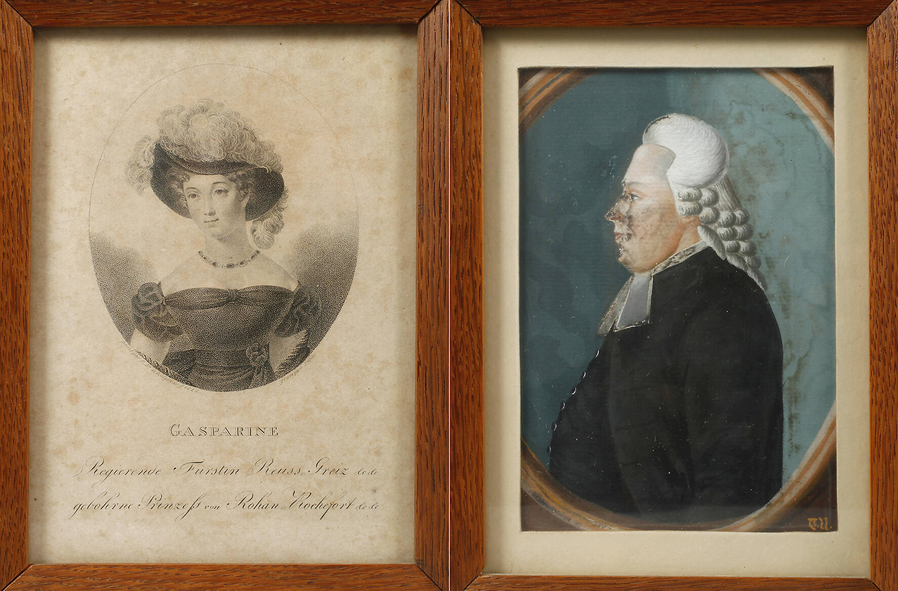 Bildnis der Gattin von Fürst Heinrich XIX. von Reuß, gekleidet in der Mode der Zeit, unter der Darstellung bezeichnet rechts "grave par G. Döbler" und links "peint par F. Bn. de Lütgendorf 1822" sowie unten mittig betitelt "Casparine Regierende Fürstin Reuss-Greiz gebohrene Prinzess von Rohan-Rochefort", Punktierstich, hinter Glas gerahmt, Darstellungsmaße ohne Schrift ca. 10,5 x 8,5 cm. beigegeben Portrait eines Herrn mit Perücke im Profil, 1. Hälfte 19. Jh., Gouache auf Papier, unter Passepartout und hinter Glas gerahmt, Passepartoutausschnitt ca. 14,5 x 10 cm.