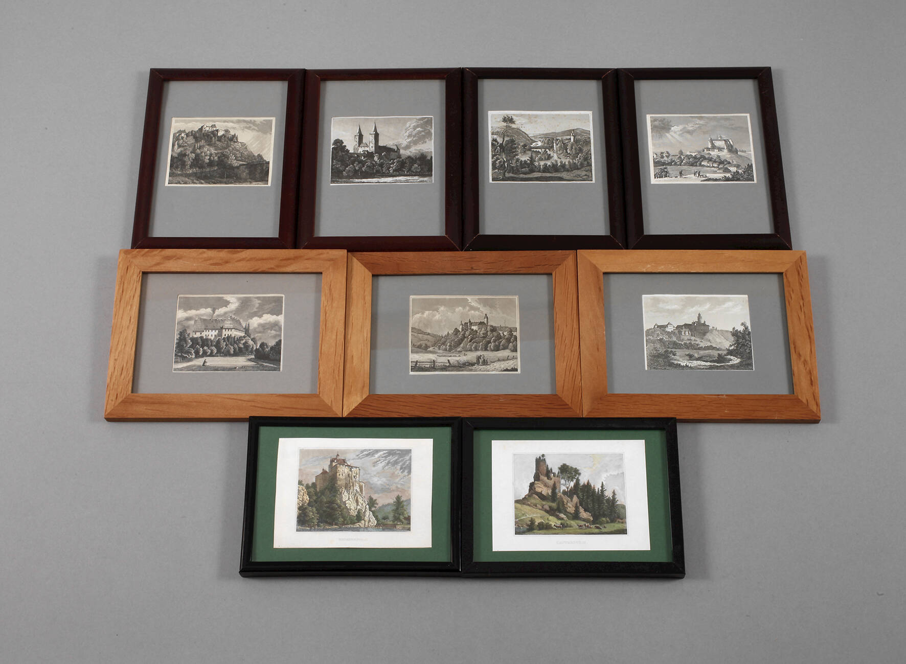 neun Arbeiten aus A. Schiffner "Beschreibung von Sachsen", enthalten ist Schloss Wolkenstein, Schloss Posterstein, Schloss Frauenstein, Schloss Trebsen an der Mulde, Burgruine Lauterstein bei Marienberg, Schloss Kriebstein, Schloss Rochlitz, Schloss Voigtsberg (Oelsnitz im Vogtland), Schloss Stein in Hartenstein, Stahlstiche, teils coloriert, um 1840, je einzeln gerahmt, Darstellungsmaße max. ca. 7,5 x 9,8 cm.