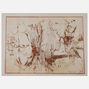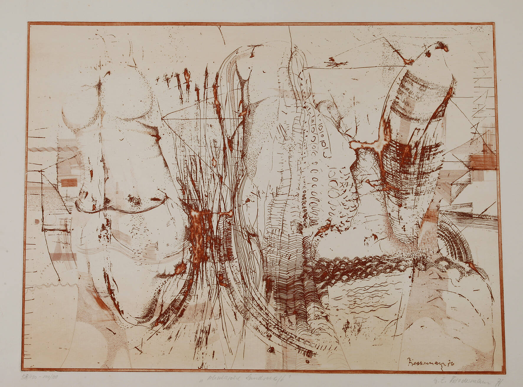 großformatige abstrakte Komposition, Radierung in Rotbraun, unter der Darstellung in Blei rechts signiert und datiert "W. E. Biedermann (19)76", links nummeriert 58/100-100/100" sowie mittig betitelt "phallische Landschaft", in der Platte nochmals signiert und datiert "Biedermann (19)76", leichte Altersspuren, Darstellungsmaße ca. 43 x 58,5, Blattmaße ca. 56,5 x 79,5 cm. Künstlerinfo: dt. Maler und Graphiker (1940 Plauen bis 2008 Leipzig), studierte 1961–67 an der HGB Leipzig bei Gerhard Kurt Müller, ab 1967 freischaffend in Leipzig, 1994–95 Aufbau eines Kunsthauses in Leipzig-Gohlis, ab 2001 Studienreisen nach Italien, Indonesien, Frankreich und den USA, 2003 Brand und anschließender Wiederaufbau des Kunsthauses, beschickte zahlreiche Ausstellungen, unter anderem in Tokio, Berlin, Paris, Stockholm und Teilnahme an der Expo 2000, ab 1996 Mitglied der Freien Akademie der Künste Leipzig, tätig in Leipzig-Gohlis, Quelle: AKL und Internet.