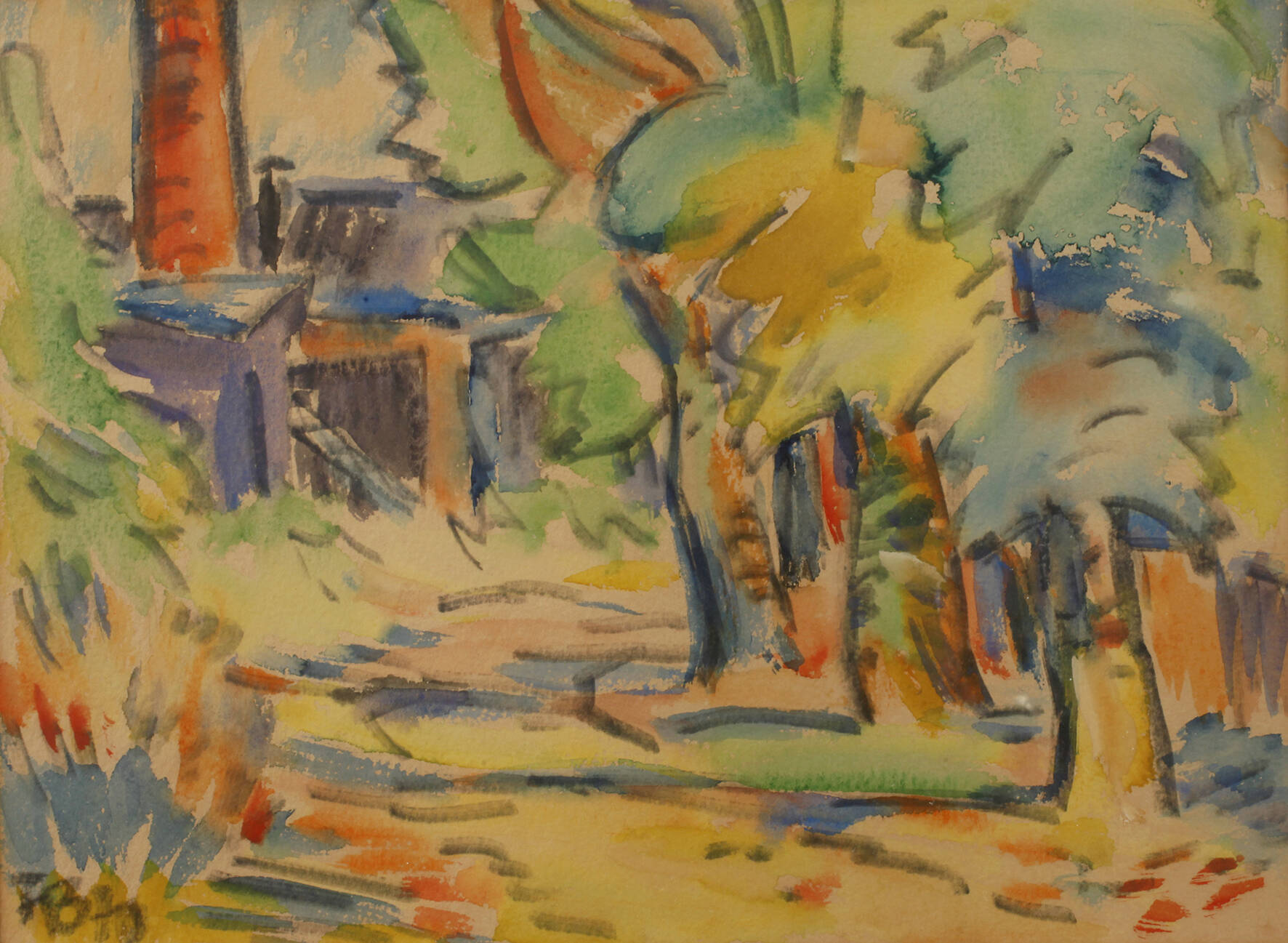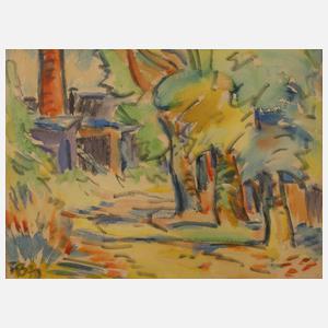 Weg in sommerlicher Landschaft, mit Durchblick auf Industriearchitektur mit Schornstein, Mischtechnik (Aquarell über Filzstiftzeichnung), links unten monogrammiert und datiert "F.B. [19]70", rückseitig Rahmungsetikett "Bilder-Geyer ... Plauen", etwas geblichen, gebräunt und lichtrandig, Pendant zu nachfolgenden Positionen, original hinter Glas und Passepartout gerahmt, Passepartoutausschnitt ca. 23 x 31,5 cm. Künstlerinfo: eigentlich Fredo Robert Bley, dt. Maler und Graphiker (1929 Mylau im Vogtland bis 2010 Reichenbach), 1943–46 Lithographenausbildung bei Carl Werner in Reichenbach, 1948–56 Lehre und Tätigkeit als Dekorations- und Schriftenmaler, Anregung durch den Maler Walter Löhner, weitestgehend Autodidakt, seit 1952 Mitglied des Verbandes Bildender Künstler (VBK) der DDR, 1957–64 als Ziegelei- und Baufacharbeiter tätig, ab 1966 freischaffend, beschickte zahlreiche Ausstellungen, unter anderem 2002 im neuen Bundeskanzleramt Berlin, tätig in Mylau, später in Buchwald, Quelle: AKL, Eisold “Künstler in der DDR”, Frank Weiß "Malerei im Vogtland" und Wikipedia.
