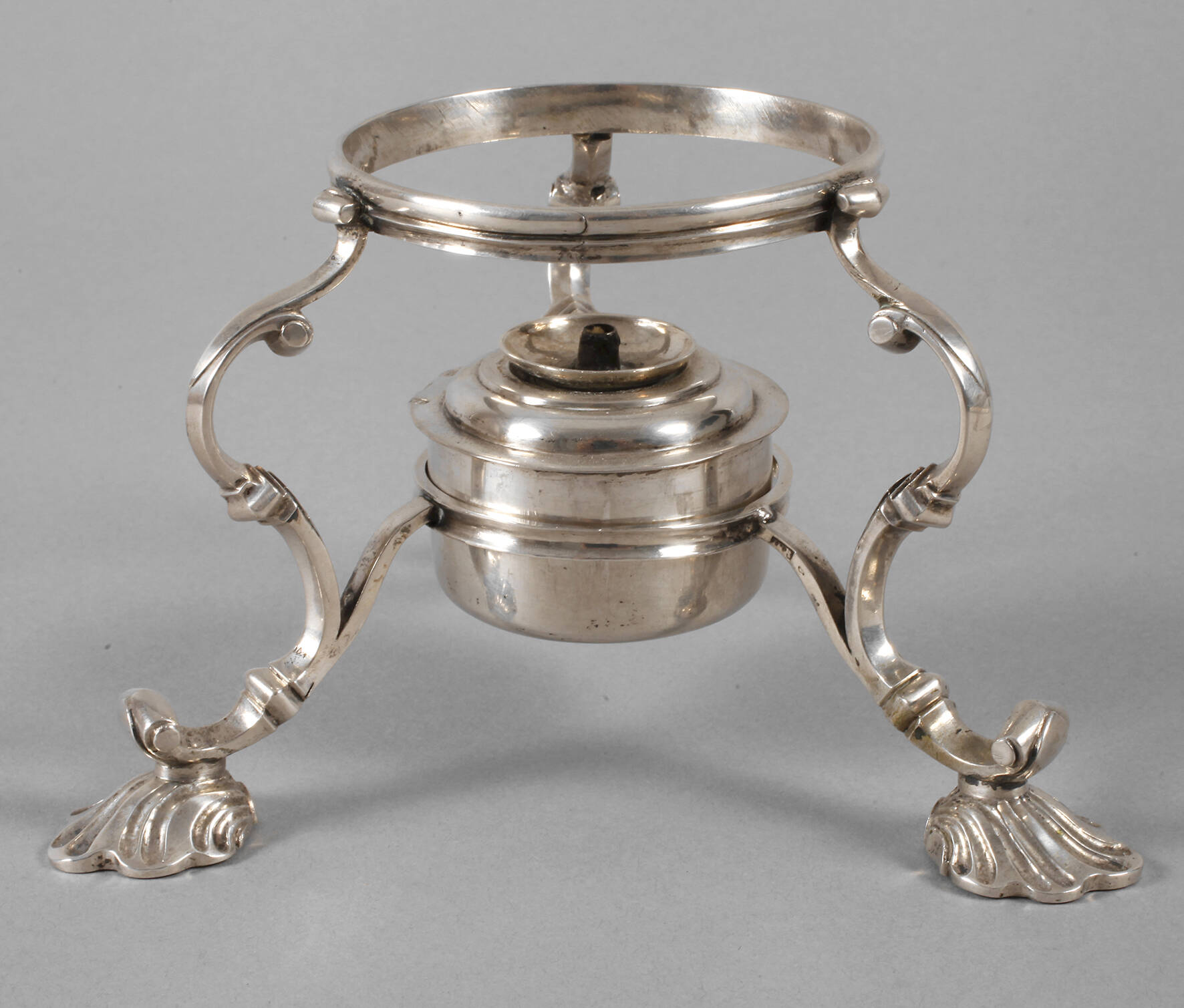 datiert 1771, Meisterpunze MT, unleserlicher Beschaumeister, aus massivem Silber, dreiteilig mit Fuß, Brenner und Deckel, dreipassig auf floral gestalteten Füßen, D 15 cm, G ca. 363 g.