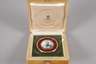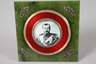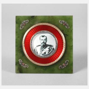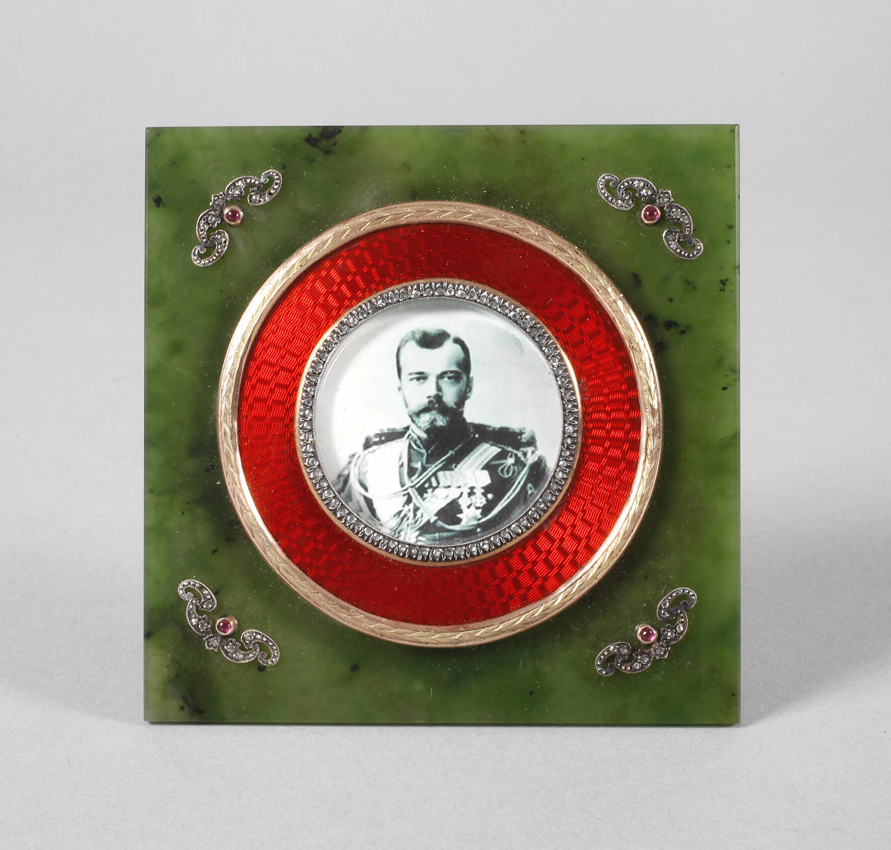 2. Hälfte 20. Jh., gestempelt 56 Zolotniki, Ständer und Einrahmung aus Rotgold, rotes Transluzidemaille auf Guillochégrund, Meisterpunze H.W. Hendrick Wigström, quadratische Nephritplatte mit vier silbernen Ornamenten und vier kleinen Rubincabochons, insgesamt 108 Diamanten im Rosenschliff, in einem Kästchen aus karelischer Birke, 10,2 x 10,2 cm.