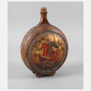 Ende 19. Jh., Holz geschnitzt, Boxbeutel mit bemalter Front, goldbronziert, Darstellung des Heiligen Demetrius?, Altersspuren, Stopfen fehlt, H 35 cm.