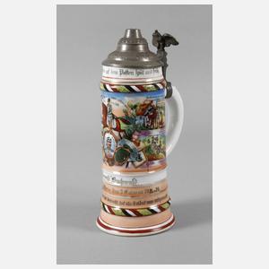 1911/14, bezeichnet "3. Esk. Jäger zu Pferde Nro. 3 Colmar", Reservist Buchwald, Devise "Wer Frankreichs Grenze hat bewacht, hat als Soldat was mitgemacht", schauseitig berittener Jäger über Bildnis des Kaisers, flankiert von Soldatenszenen, rückseitig zwei Namensleisten, Abschiedsszene als Bodenlithophanie, ornamental gestalteter hoher Zinndeckel, Adler als Drücker, Standring restauriert, H max. ca. 28 cm.