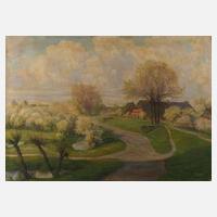frühlingshafte Ansicht von reetgedeckten Bauernhäusern im heute zu Hamburg gehörenden Finkenwerder, gering pastose Landschaftsmalerei, Öl auf Leinwand und Keilrahmen, um 1920, rechts unten betitelt, signiert und ortsbezeichnet "Finkenwerder – A. O. Noah Lokstedt", Craquelure, etwas restaurierungsbedürftig, ungerahmt, Maße ca. 70 x 97 cm. Künstlerinfo: dt. Landschafts- und Theatermaler (1885 Meißen bis 1968 Hamburg), Schüler der Kunstgewerbeschule Dresden, anschließend sieben Jahre Theatermaler an der Königlichen Hofoper [Semperoper] Dresden, studierte 1907–10 an der Dresdner Akademie, hier Meisterschüler bei Eugen Bracht, betrieb 1910 bis zur Einberufung 1915 zum Kriegsdienst eine private Malschule in Chemnitz, ab 1918 in Hamburg-Lokstedt tätig, bis 1933 Mitglied der Hamburgischen Künstlerschaft, im 2. Weltkrieg Zerstörung von Haus und Atelier, ab 1943 in Kappeln an der Schlei, 1944–45 Kriegsdienst und -gefangenschaft in Belgien, 1954 Rückkehr nach Hamburg, unternahm Studienreisen durch Sachsen, den Harz, den Schwarzwald, die Alpen sowie nach Italien, Griechenland, Norwegen, Portugal und Mallorca, Quelle: Wikipedia, Ursula Dietsch "Der Kunstmaler Alexander Oskar Noah erzählt von seinem Leben", Info Horst Grigat, Rump und Schülerlisten der Dresdner Akademie.