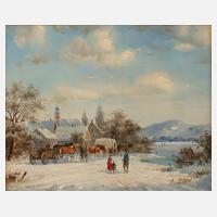 sonniger Blick auf Pferdegespanne vor einem Dorf, am Ufer eines zugefrorenen Sees, vor der Kulisse einer Bergkette, unter luftig bewölktem Himmel, minimal pastose Malerei in freundlicher Farbigkeit, Öl auf leinenkaschierter Sperrholztafel, um 1990, rechts unten signiert "D. Peltzer", gerahmt, Falzmaße ca. 24 x 30,5 cm.