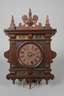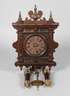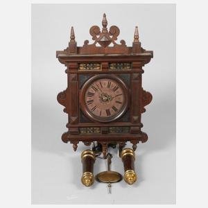 Schwarzwald, um 1880, Gehäuse aus massivem Nussbaum, verziert mit geprägter Ornamentik, partiell vergoldet, Holzplatinenwerk mit Halbstundenschlag auf Tonfeder, geprägte Firmenmarke sowie A.D., gangfähig, mit Gewichten und Pendel, Zierteile teilweise ergänzt H 51 x B 30 x T 15 cm.