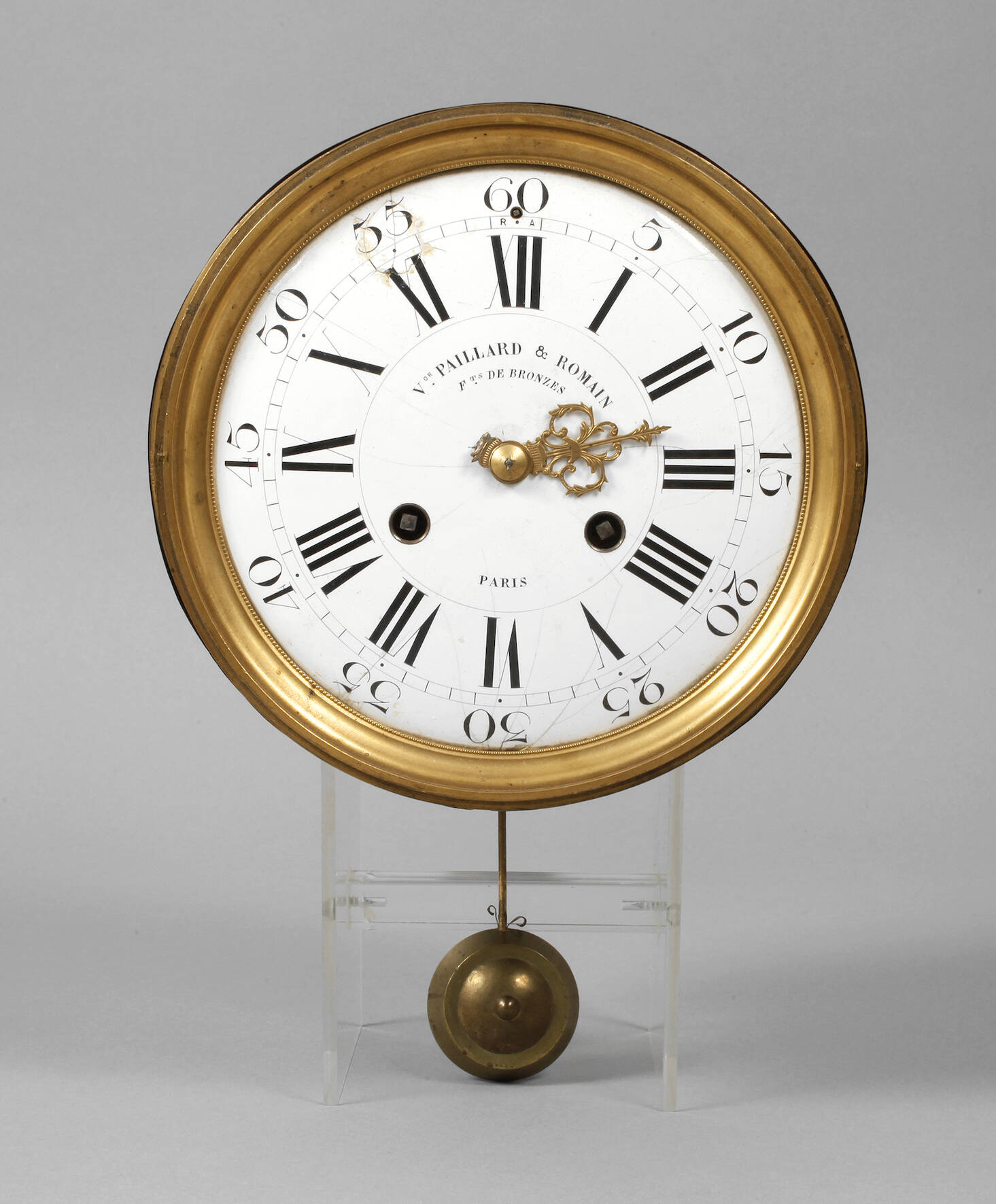2. Hälfte 19. Jh., auf Werkplatine ebenfalls gemarkt Paillard a Paris, Pendulenwerk mit Halbstundenschlag auf Glocke, emailliertes Ziffernblatt mit römischen Zahlen und arabischer Minuterie, Emaille mit Haarrissen und geklebtem Chip, Stundenzeiger fehlt, Gehäuse in Messingblech nachgefertigt, ohne Pendel und Schlüssel, D 19 cm.