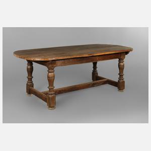 Münsterland, 18. Jh., Eiche massiv, dunkelbraun gebeizt, lange Platte mit abgerundeten Schmalseiten, Gestell mit hoher profilierter Zarge, die Beine mit gedrechseltem Baluster, auf flachen Scheibenfüßen stehend, Oberfläche mit Alters- und Gebrauchsspuren, Maße 75 x 215 x 109 cm.
