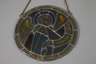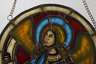 19. Jh., Rundfenster mit eingesetzten Segmenten aus Farb-und Ornamentglas, polychrom gefasst, Darstellung eines Erzengels mit Schriftrolle, an Gliederkettchen abgehängt, Altersspuren, kleinere Lötstellen, D 27 cm.