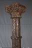 um 1800, Eiche massiv, dunkelbraun gebeizt, Postament aus Sandstein, allseitig aufwendig geschnitzt, das Kapitell abnehmbar, Reste alter Farbfassung, Alters- und Gebrauchsspuren, H 222 cm