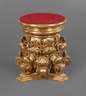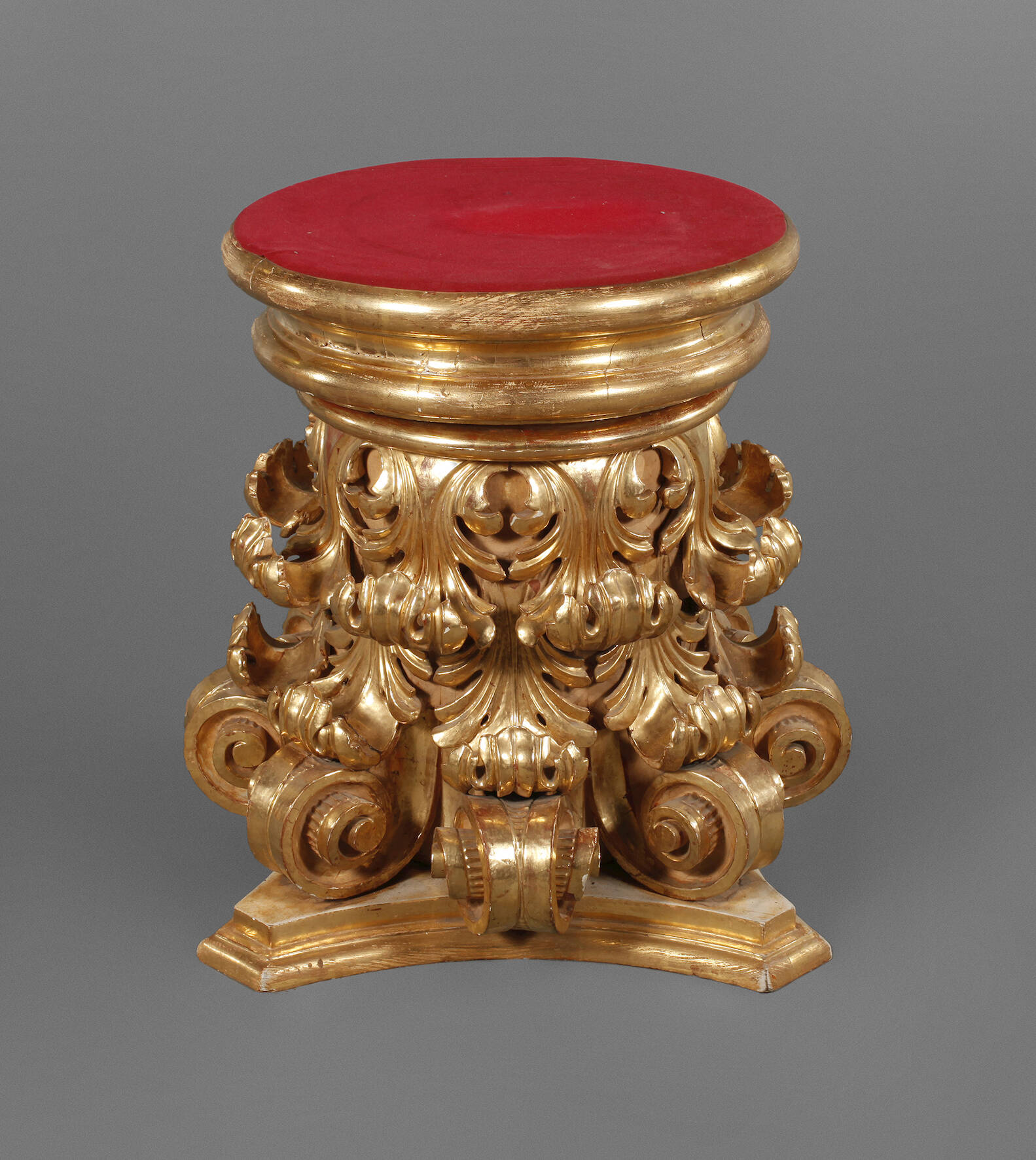 ehemaliger Abschluss einer prächtigen Säule, Holz geschnitzt und blattvergoldet, zweckentfremdet als Tischfuß genutzt, eine Seite mit eingekürztem Sockel und gestutztem Blattwerk, Maße 63 x 68 x 60 cm.