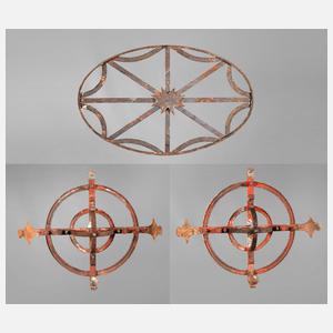 Schmiedeeisen 2. Hälfte 19. Jh., 2 x Fassadenschmuck und ein ovales Gitter im klassizistischen Stil, Oberfläche korrodiert, Reste alter Farbfassung, Maße Gitter 61 x 38 cm, Zierelement 60 x 50 cm.