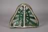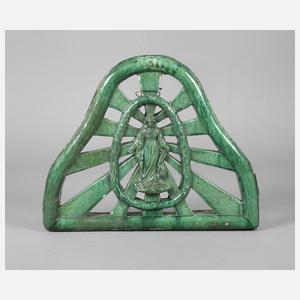 Mitte 18. Jh., sandfarbener Scherben, grün glasiert, durchbrochen gearbeitete Krone mit Mariendarstellung, umgeben von Lorbeerkranz, restaurierte Fehlstellen, Maße 32 x 38 cm.