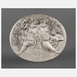 Steinguss, 2. Hälfte 20. Jh., ovale Platte mit drei weinseligen Bacchanten, Maße 60 x 69 cm.