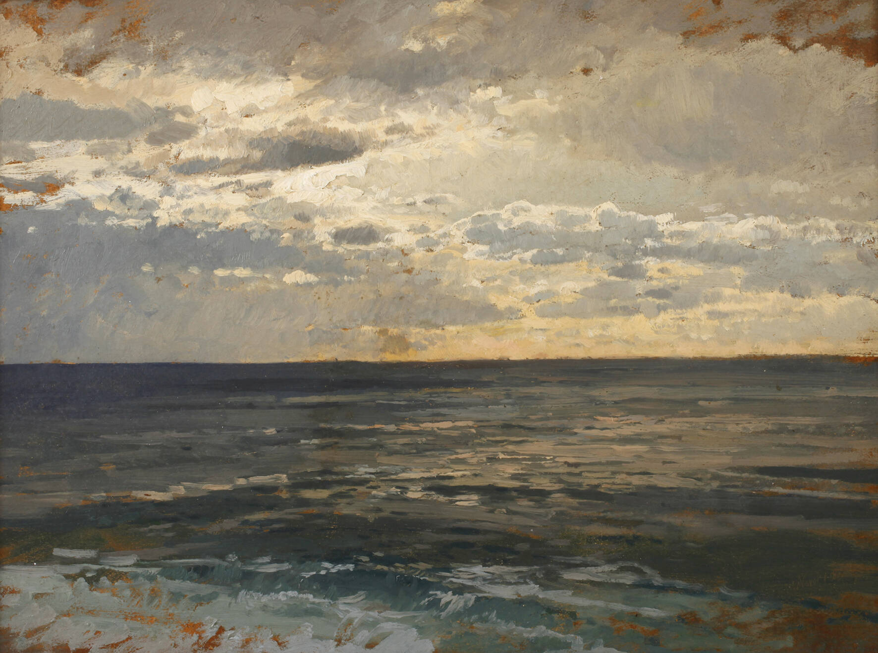 weiter Blick vom Strand der ligurischen Küste übers stille Meer, unter effektvoll bewölktem Himmel, stimmungsvolle, gering pastose, studienhafte Malerei, Schuster galt als einer der begabtesten und letzten Schüler Ludwig Richters, bereits 1874 ermunterte Richter seinen Schüler – er möge unbedingt nach Italien reisen „um den Gegensatz unserer einfachen nordischen Gegenden umso geschärfter auffassen zu können.“, Schuster folgte nach Jahren in Oberbayern und in den deutschen Mittelgebirgen im Jahre 1879 Richters Rat und begab sich – als Maler bereits gefestigt – auf seine erste Studienreise nach Italien, anders als sein Lehrer Ludwig Richter und mancher in Rom wirkender Deutschrömer, die in Italien die Vorlage für zu komponierende, romantische Ideallandschaften fanden, erfasste Schuster die Landschaft ohne arrangierte kompositorische Zugaben in ihrem Wesen und ihrer natürlichen Großartigkeit und Sinnlichkeit, die vorliegende Studie ist beredtes Zeugnis hierfür und dürfte unmittelbar vor Ort in Öl auf Karton entstanden sein, rechts unten teils unleserlich ritzbezeichnet "Nervi/Der ...", unsigniert, rückseitig Infos zum Gemälde und zum ehemals auf der Rückseite angebrachten Etikett "Rudolf Schuster Markneukirchen # 793, Nervi 1.12.1879 ...", dazu lückenlose Provenienz bis zu Rudolf Schuster zurück verfolgbar, Fehlstellen im Malgrund retuschiert, Altersspuren, gerahmt, Falzmaße ca. 36,5 x 48 cm. Künstlerinfo: eigentlich Rudolf Heinrich Schuster, dt. Maler und Illustrator (1848 Markneukirchen im Vogtland bis 1902 ebenda), Kindheit und Schulbesuch in Plauen, studierte ab 1863 an der Akademie Dresden, 1867–73 einer der talentiertesten Atelierschüler von Ludwig Richter, anschließend Aufenthalt in München und beeinflusst von Eduard Schleich und Adolf Heinrich Lier, unternahm zahlreiche Studienreisen nach Böhmen, der Schweiz, Tirol, Italien, Österreich, dem Erzgebirge und der Eifel, 1875–76 in Düsseldorf tätig, zeitweise in Stuttgart, 1882–85 im Riesengebirge, 1886–88 in Berlin, 1891–94 in Dresden-Teplitz, 1894–96 in Weimar, 1898–1900 in Meran und krankheitsbedingt ab 1900 in Markneukirchen, Quelle: Thieme-Becker und Frank Weiß „Malerei im Vogtland“.