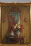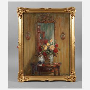 Blick in sonniges, herrschaftliches Interieur, mit Rosenstrauß vor goldenem Barockspiegel, gering pastose Malerei, Öl auf Leinwand, um 1930, rechts unten signiert und ortsbezeichnet "Rud. Poeschmann Dresden", rückseitig betitelt "Am Spiegel" und signiert "Rud. Poeschmann Dresden A 24", im Goldstuckrahmen, Falzmaße ca. 68 x 50,5 cm. Künstlerinfo: eigentlich Karl Julius Rudolf Poeschmann, auch Rudolph, dt. Landschafts- und Genremaler (1878 Plauen/Vogtland bis 1954 Dresden), Kindheit in Plauen, hier Förderung durch den Zeichenlehrer Hermann Reinstein (1844–1935), anschließend Privatschüler einer Münchner Kunstschule, studierte ab 1896 an der Akademie München bei Johann Caspar Herterich, ab 1897 Studium an der Akademie Dresden bei Carl Bantzer und Meisterschüler bei Gotthard Kuehl, anschließend freischaffend in Dresden, regelmäßige sommerliche Studienreisen durch Sachsen (besonders das Vogtland, Erzgebirge und die Lausitz), nach Franken, in den Harz sowie nach Österreich, Holland, Frankreich (Paris) und in die Schweiz, beschickte diverse Ausstellungen wie den Glaspalast München, Mitglied der Münchner Künstlergenossenschaft, im Reichsverband Bildender Künstler Deutschlands, in der Dresdner Künstlervereinigung, im Dresdner "Märzbund" und der Allgemeinen Deutschen Kunstgenossenschaft, tätig in Dresden, Quelle: Thieme-Becker, Vollmer, Saur "Bio-Bibliographisches Künstlerlexikon", Dressler, Müller-Singer, Matrikel der Dresdner und der Münchner Akademie, Glaspalastkataloge und Frank Weiß "Malerei im Vogtland".