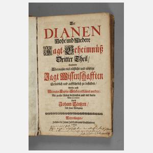 Dritter Theil, darinnen abermahln viel nützliche und nöhtige Jagt Wissenschaften [...], mit grosser Arbeit beschrieben und viel darin neu-inventiret durch Johann Täntzern, Copenhagen bei Johann Jost Ernthropilus Buchhändlern 1689, Format 4°, 9 Bl., 132 S., 12 Bl., Kupfernes Titelfrontispiz, 14 doppelseitige Kupfertafeln, Rotschnitt, Einband fragmentarisch erhalten, Seiten gegilbt, Altersspuren.