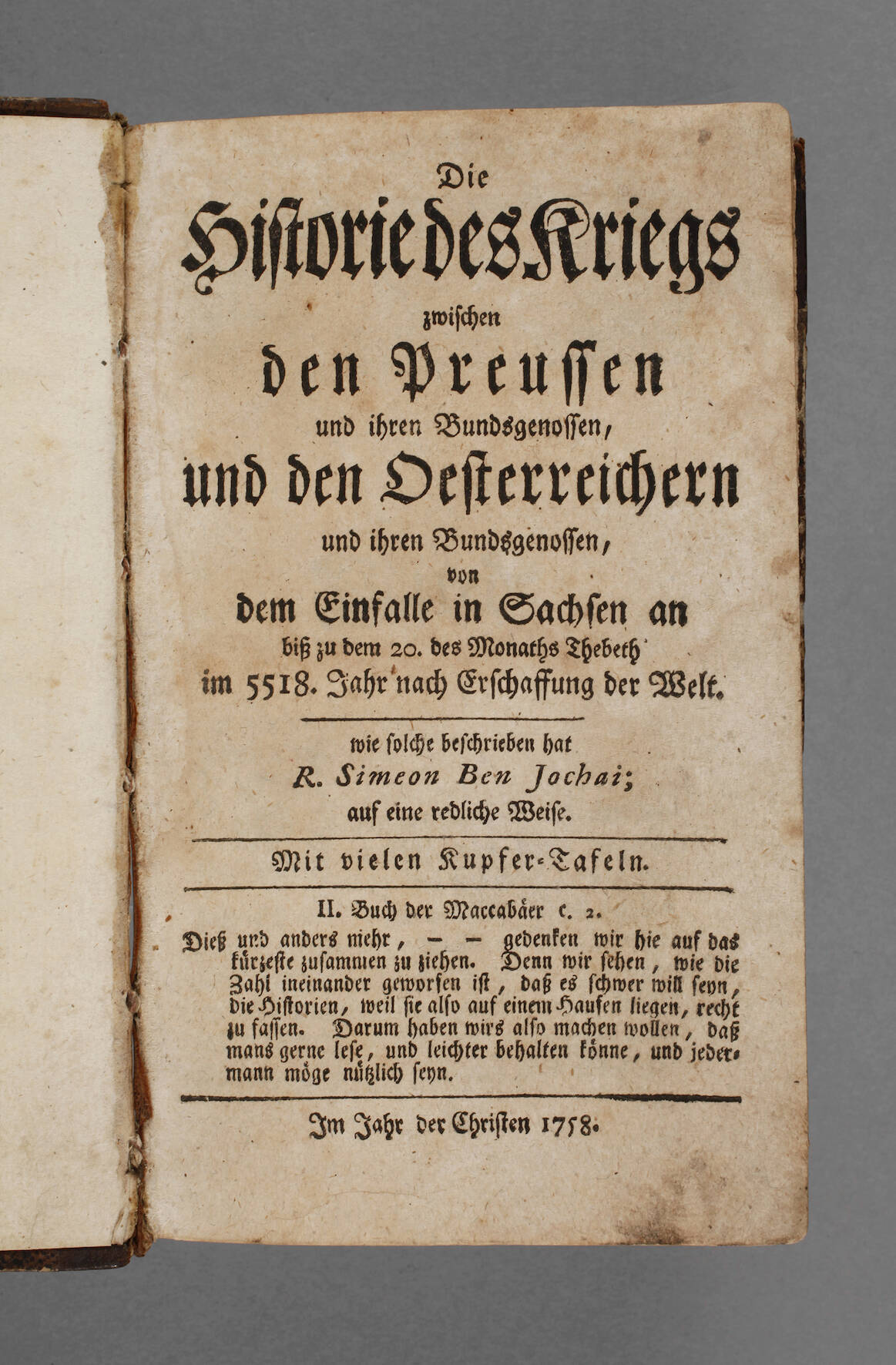 zwischen den Preussen und ihren Bundsgenossen und den Oesterreichern und ihren Bundsgenossen [...], R. Simeon Ben Jochai 1758, Format Kl. 8°, 8 Blatt/366 S., 14 Kupfer, schlichter Halbledereinband der Zeit mit stärkeren Studierspuren, Rücken brüchig, sonst normale Altersspuren.