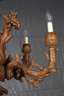 aus einem Jagdzimmer, 1930er Jahre, Lindenholz massiv, naturalistisch geschnitzte fünfflammige Deckenkrone, verziert mit Eichenlaub, Tannenzapfen und Astwerk, die Tüllen in Form einer Eichel gearbeitet, Funktion nicht geprüft, H 80 cm, D 72 cm.