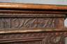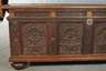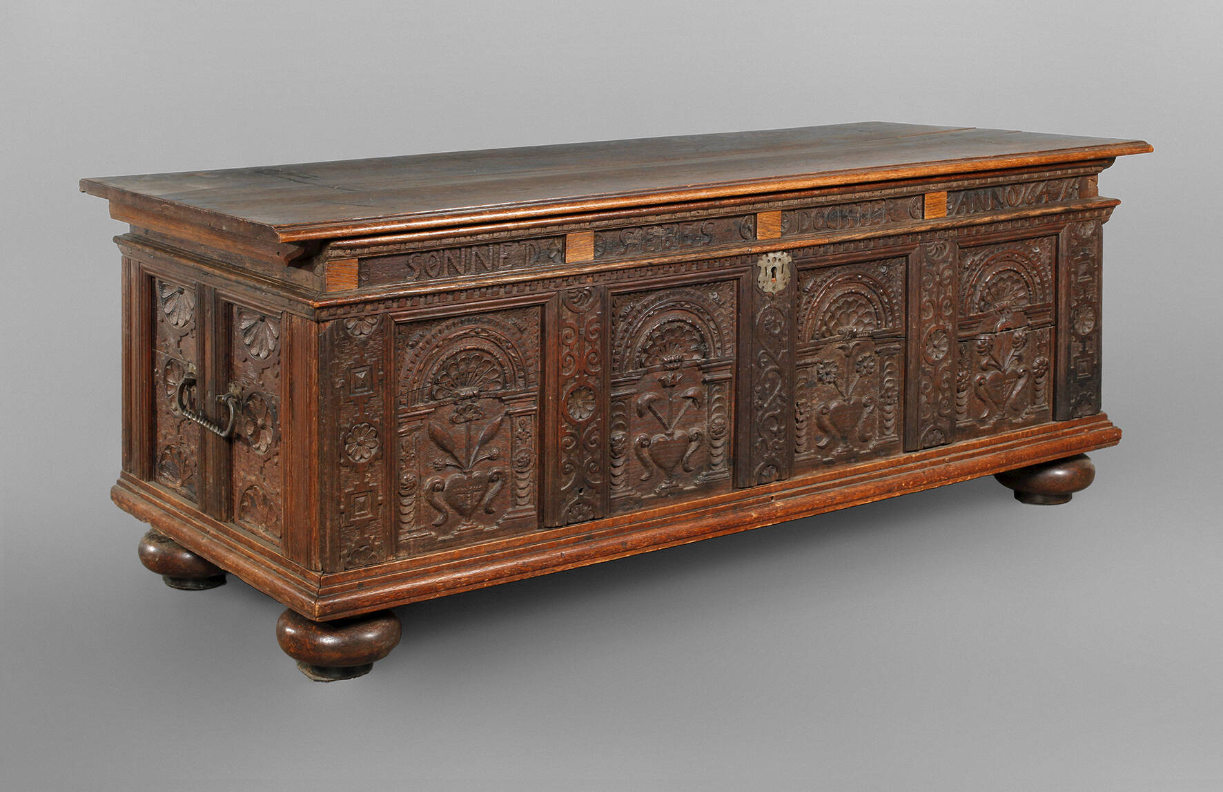 datiert 1647, Eiche massiv, dunkelbraun gebeizt, reich beschnitzte, fassadenartig gestaltete Front mit vier Kassetten, auf vier gequetschten Kugelfüßen, die Seiten mit jeweils zwei Kassetten und Tragegriffen aus Eisen, altes, nicht originales Schloss, Schlüssel fehlt, Alters- und Gebrauchsspuren, Maße 75 x 194 x 76 cm.