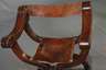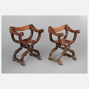 wohl Italien, 17. Jh., das klappbare Gestell aus massiver Buche, die geschwungenen Armlehnen mit geschnitzten Rosetten und ornamentaler Punzierung aus Nussbaum gefertigt, Füße mit geschnitzten Löwentatzen, Lederbezüge erneuert, alt repariert, stärkere Alters- und Gebrauchsspuren, ein Ziernagel fehlt, Maße 85 x 64 x 47 cm.