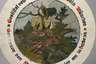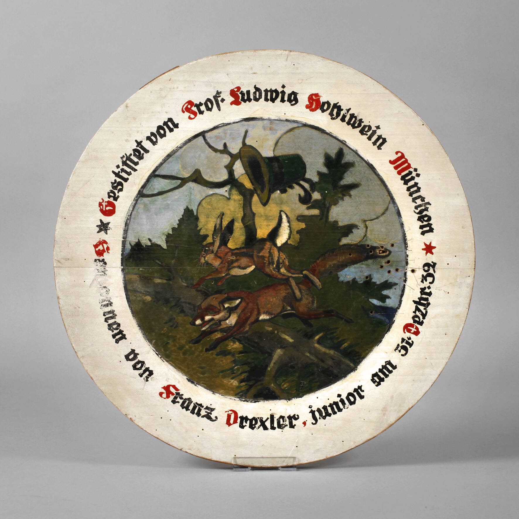 datiert 1932, Weichholz mehrfarbig gefasst, mit Umschrift „Gestiftet von Prof. Ludwig Hohlwein München. Gewonnen von Franz Drexler junior am 31. Dezember 32“, zentrale Darstellung von Fuchs, Hase und Jägershut in Landschaft, Alters- und Gebrauchsspuren, D 49 cm.