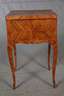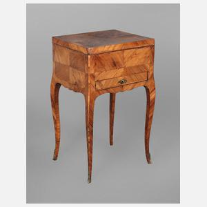 Mitte 18. Jh., Rosenholz auf Eiche furniert, fast quadratischer Korpus mit klappbarer Platte, getragen von leicht s-förmig geschwungenen filigranen Beinen, die Front mit schmaler Schublade, diese mit intarsiertem Spielbrett und Fächern für Spielsteine, originales Schloss und Beschläge, alt restauriert, Alters- und Gebrauchsspuren, Maße 75 x 44 x 37 cm.