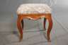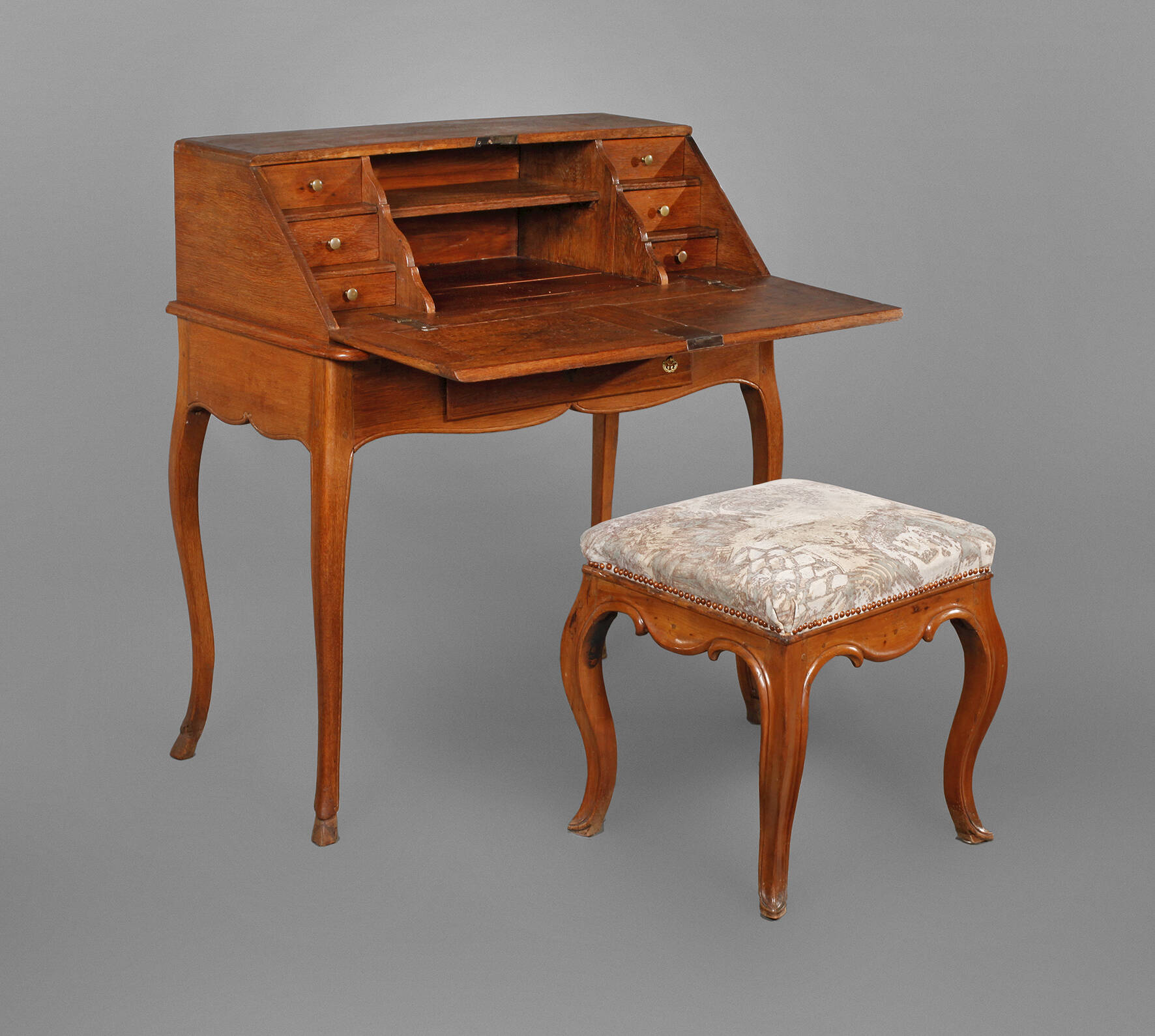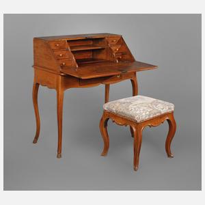 um 1750, Eiche massiv, elegant geschwungenes Gestell mit Rehfüßen, die Klappe mit geschnitzten Kassettenfüllungen, figürlich gestalteter Messingbeschlag, mit Schlüssel, dazu nicht ganz passender barocker Hocker aus massivem Nussbaum, Polster und Bezug erneuert, Alters- und Gebrauchsspuren, Maße 100 x 90 x 48 cm.