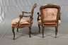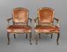 2. Hälfte 18. Jh., Buche massiv, fein geschnitztes geschwungenes Gestell, verziert mit Rocaillen und Blüten, kreidegrundiert und vergoldet, Samtbezüge erneuert, Oberfläche mit stärkeren Alters- und Gebrauchsspuren, stabiler Zustand, H 93 x B 67 x T 58 cm.