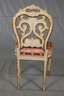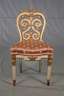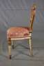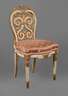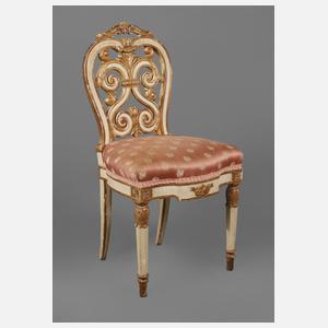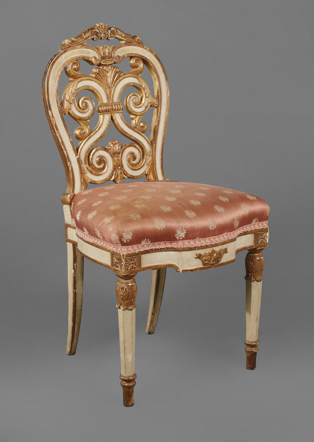 1. Hälfte 18. Jh., Buche massiv, fein geschnitzt und kreidegrundiert, farbig gefasst und vergoldet, Sitzfläche mit Federpolster und Rosshaarbespannung, altrosafarbener Sitzbezug, originale Farbfassung und Vergoldung, mit kleineren Fehlstellen und Altersspuren, stabiler Zustand, H 88 cm, SH 45 cm.