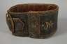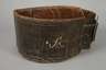 alpenländisch, 19. Jh., aus dunkelbraunem Leder mit ornamentalem Muster und Besitzermonogramm AM, Messingschließe, alt repariert, L 90 cm.