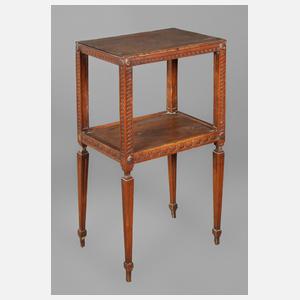 Nussbaum massiv, um 1780, zartes Gestell mit geschnitztem Zopfmotiv, Zahnleiste und Eierstab verziert, die Füße spitzzulaufend und kanneliert, unrestaurierter Originalzustand mit Altersspuren, Platte mit Trocknungsriss, Maße 74 x 43 x 31 cm.