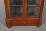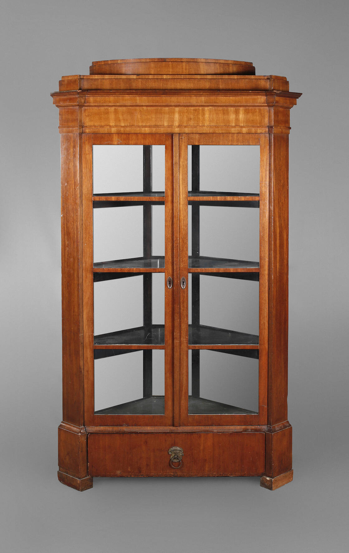 um 1820, Mahagoni auf Nadelholz furniert, zweitüriger Korpus mit abgeschrägten Ecken, Sockel mit Schubkasten, innen mit drei ebonisierten Einlegeböden, verspiegelte Rückwand, originale Verglasung mit mundgeblasenen Scheiben, eine Scheibe gerissen, kleinere Furnierfehlstellen, restaurierungsbedürftig, Maße 195 x 115 x 53 cm.