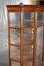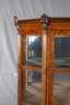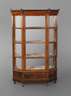 Mitte 19. Jh., Nussbaum und Nussbaummaserfurnier, trapezförmiger Korpus mit Spiralsäulen verziert, drei feststehende Regalböden, originale verspiegelte Rückwand, Sockel mit Schubkasten, zwei Spiegel und eine Glasscheibe mit Spannungsriss, Alters- und Gebrauchsspuren, Maße 170 x 102 x 48 cm.