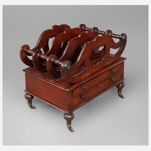 England, 2. Hälfte 19. Jh., Mahagoni massiv, auf Messingrollen gelagert, Sockel mit zwei flachen Schubkästen, alt restauriert, eine Rosette fehlt, Maße 47 x 52 x 35 cm.