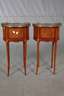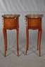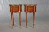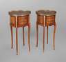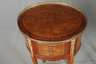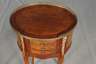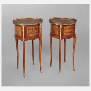20. Jh., Mahagoni und Rüsterwurzel furniert, ovaler Korpus mit drei Schubladen und Messingzierbeschlägen, leichte Altersspuren, Maße 74 x 41 x 32 cm.