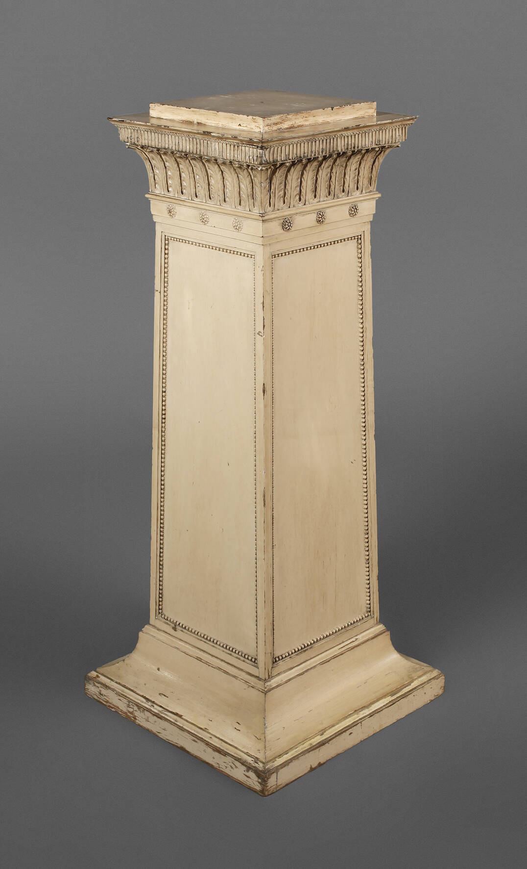 Ende 19. Jh., Holz geschnitzt und farbig gefasst, leicht konische Säule auf quadratischem Stand, verziert mit geschnitzten Lanzettblättern, Rosetten und Perlstab, die cremefarbene Fassung mit altersbedingten Farbverlusten, Maße 120 x 52 x 52 cm.