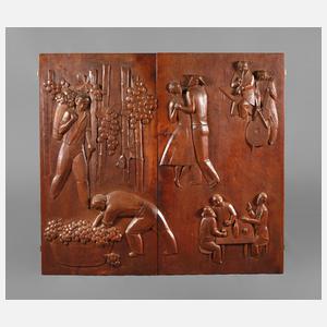 deutsch, 1930er Jahre, Nussbaum massiv, zwei Flügel mit der Darstellung einer Weinlese sowie junges Paar beim Tanz, Oberfläche mit schöner Patina, Maße gesamt 95 x 105 cm.