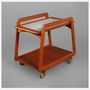 Dänemark, 1960er Jahre, Teakholz massiv, schlichtes Gestell auf Rollen und mit abnehmbarem Tablett, dieses wahlweise mit Holz und grauer Kunststoffoberfläche, guter Zustand, Maße 57 x 62 x 42 cm.