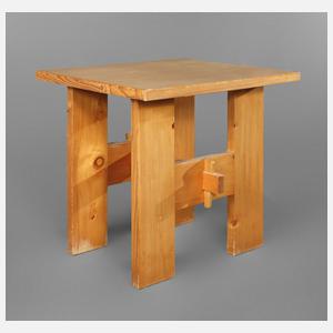 Ausführung Tischlerei Jungnickel Schwarzenberg, 1970er Jahre, Fichtenholz massiv, Platte aus Schichtholz, guter Zustand mit geringen Gebrauchsspuren, Maße: 64 x 57 x 67 cm. Info: diese Möbel fanden unter anderem Verwendung im FDGB-Ferienheim Oberwiesenthal und im Restaurant Zechengrund am Fichtelberg.