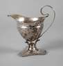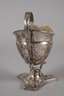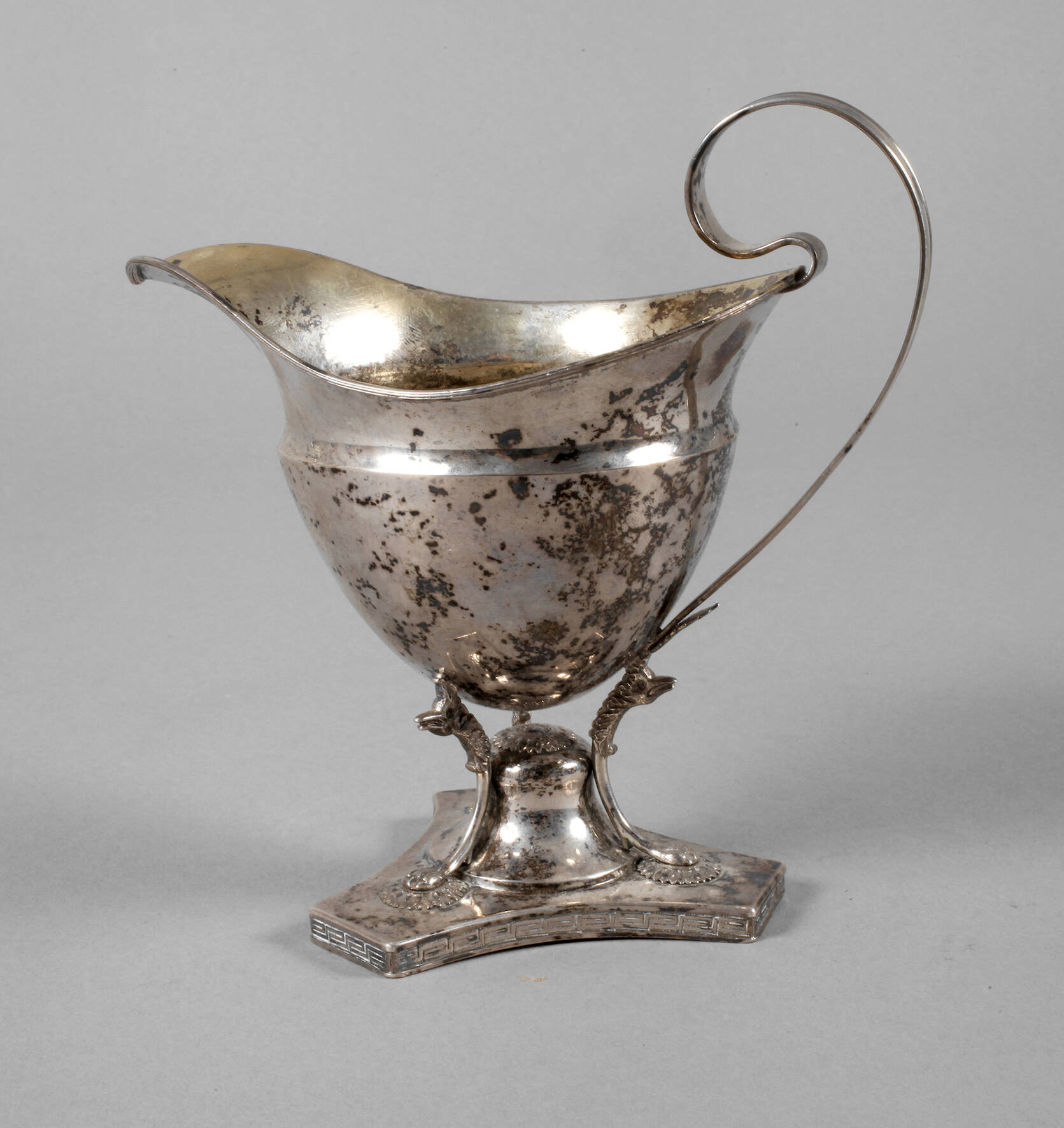 Schweden, um 1800, gestempelte Drei-Kronen-Marke, Meister NPL im Rechteck, Beschauzeichen Karlskrona 17. und 18. Jh., weiter V3, dreipassiger Stand, darüber Tatzenfüße mit Greifenköpfen, das helmförmige Gefäß haltend, innen vergoldet, hochgezogener Bandhenkel, mehrteilig verschraubt, guter altersgemäßer Zustand, H 16,5 cm, G ca. 257 g.