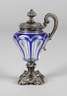 Mitte 19. Jh., Fuß, Henkel und Deckel aus dünnwandigem Silberblech mit reichem Reliefdekor gearbeitet, Korpus aus geschliffenem Kristallglas blau überfangen, Altersspuren, H 15 cm.