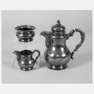 wohl um 1890, gestempelt Halbmond, Krone, 925, Herstellermonogramm ERD für Ernst Strohbach Rudolf Schöne, Dresdner Silberwarenfabrik, martelliert, Griffe und Ausgüsse mit floralen Reliefs verziert, seitlich scharnierter Klappdeckel, angelaufen, in ungeputztem und unbenutztem Zustand, H Kanne 18 cm, G ca. 526 g.