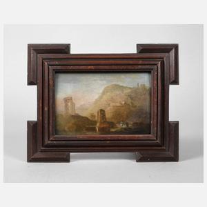 Wanderer vor antiken Ruinen in bewegter, abendlicher mediterraner Sommerlandschaft, gering pastose Malerei, hierzu bemerkt die Allgemeine Deutsche Biographie: "Norbert Grund, einer der fruchtbarsten Kleinmaler Böhmens, ... dieses ganz seltsam aus seiner zeitgenössischen Umgebung vortretenden Künstlers. Leicht tocki[e]rt, meist auf einen – neuester Zeit wieder in die Mode gekommenen – silbergrauen Hintergrund versetzt, heben sich die fein colorirten, putzigen Figürchen oder Scenerien lebensfrisch ab ...", Öl auf Holzplatte, um 1760, unsigniert, rückseitig bezeichnet "Grund", geringe Craquelure, Malplatte etwas gebaucht, Retuschen, schön im alten Rahmen mit ausgestellten Ecken gerahmt, Falzmaße ca. 10,5 x 15 cm. Künstlerinfo: eigentlich Norbert Joseph Carl Grund, irrtümlich auch Gründ, böhmischer Maler (1714 oder 1717 Prag bis 1767 Prag), Sohn und bis 1737 Schüler seines Vaters Christian Grund (ca. 1686–1751, Hofmaler des Grafen Norbert Vincenz Kollowrat-Liebsteinsky, welcher als Pate Norbert Grund mäzenatisch förderte), ab 1738 in Wien beeinflusst durch Werke des Malers und Radierers Franz de Paula Ferg, Wanderschaft durch Italien (Venedig) und Deutschland (Würzburg, Seinsheim), wohl 1741 Rückkehr nach Prag, ab 1752 Mitglied und Meister der Malerzunft der Prager Kleinseite, ab 1753 deren Prinzipal, Quelle: Thieme-Becker, Saur "Bio-Bibliographisches Künstlerlexikon", AKL, Dlabacž "Allgemeines historisches Künstler-Lexikon für Böhmen und zum Theil auch für Mähren und Schlesien", Wurzbach, Nagler, Allgemeine Deutsche Biographie, Neue Deutsche Biographie, Bénézit, Seubert, Müller-Singer und Wikipedia.