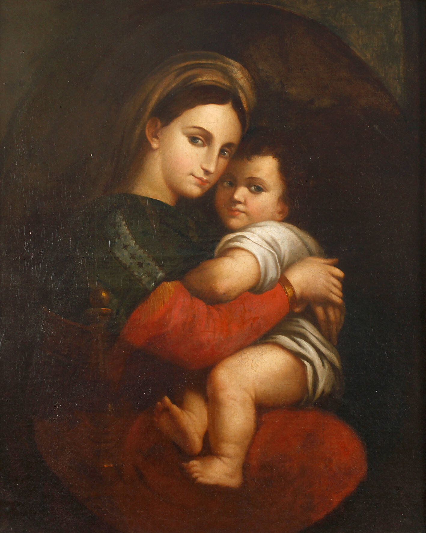 Darstellung der im Sessel sitzenden Gottesmutter Maria, mit dem Jesuskind auf dem Arm, freie Kopie nach dem berühmten Tondo-Gemälde Raffaellos Sanzio da Urbinos (1483–1520, genannt Raffael) "Madonna della Seggiola [Madonna im Sessel]" bekannt auch als "Madonna della Sedia", welches sich heute im Palazzo Pitti in Florenz befindet, bei dem vorliegenden Gemälde wurde unter Weglassung der Figur Johannes des Täufers und teils veränderter Farbstellung das ursprüngliche Rundgemälde geschickt in ein hochrechteckiges Format überführt, gering pastose Malerei, Öl auf Leinwand, um 1700, unsigniert, Craquelure, Hinterlegungen der Leinwand, restauriert, schön gerahmt, Falzmaße ca. 107 x 82 cm.